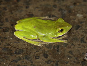 ◆アマミアオガエル 【奄美大島・徳之島固有種】 体長はオスで3〜5センチ前後、メスで5〜8センチ前後とメスが大きい。環境により明るい緑や暗緑色に変化する。 産卵行動が他のカエルと違い、水際の木の枝や草に泡状の卵塊をつくり卵を産む習性がある。産卵は1月下旬ごろから始まる。鳴き声はクリリリ、クリリリ。 |