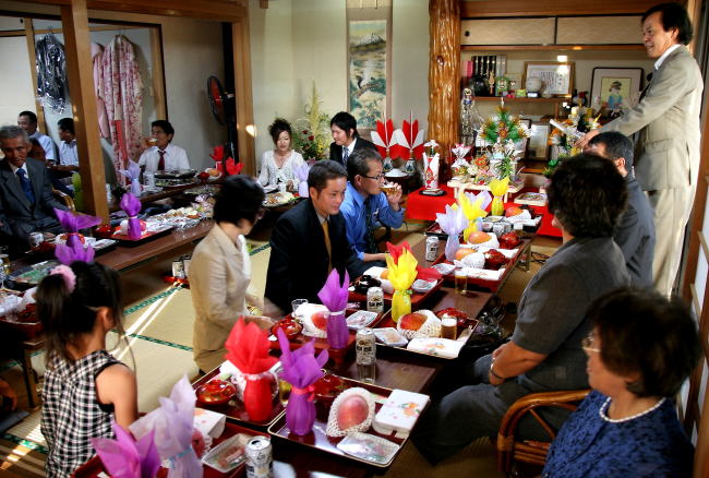 | 徳之島の結婚式は昭和50年ごろまで、公民館や各家庭で執り行われていた。 近年は、ほとんどが会費制でホテル等で行われる。 都会からの出席者は人数の多さ(200〜300人)、時間の長さ(3〜4時間)、余興の多さに目を見張る。特に余興は、島唄・踊り・劇等、色んな出し物があり、まるで学芸会のようだと喜ぶ。 このほど、天城町松原で最近では珍しい自宅での結婚披露宴があった。新郎の興 裕樹さん(23)=亀津=と久田エリカさん(23)=松原=は、午前中、結納を済ませ、午後から久田家で親族が集まって新郎新婦の門出を祝った。二人は樟南第二高校の同級生で、修学旅行先の北海道スキー場でお互いを意識するようになり今回の結婚に至ったという。 |