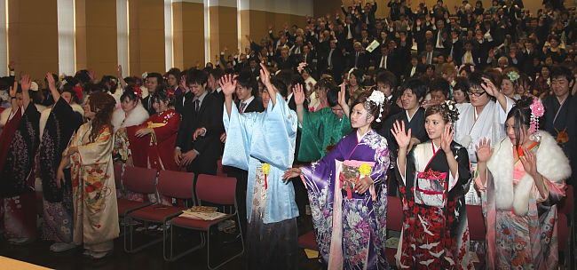 万歳三唱で成人を喜び合う=伊仙町ほーらい館