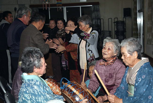 | 旧正月に当たる23日夜、徳之島町北端にある手々集落(田原喜栄区長、70世帯、180人)で、伝統行事の「まんきゃあしび」が行われた。集落はずれにある福祉会館に手々小中学校のふるさと留学生や地域住民ら約50人が参加。 午後7時過ぎ「ハイウネ まんきゃがでぃ来(きゅ)んど 門(かどう)やがあでぃ来(きゅ)んど ハイウネウネ なねんたどやがでぃ まんきゃあしび ソラソラ」 と、1番から16番まで、太鼓に合わせて掛け唄と独特の手踊りが始まった。 最初は座って踊っていたがテンポが速くなると老若男女が総立ちになってエネルギッシュに踊り出した。 「まんきゃ」とは、福を招くという意味で、かつては新築の家で行なわれていたが近年新築の家がないので福祉会館で行なっている。 政 武文さんは「手々集落には、県の無形文化財のむちたぼりなどの伝統行事があるが、唄うメンバーが高齢化して歌える人が少なくなって来たので次の世代への伝承が課題だと」歌い手不足を心配していた。 |
