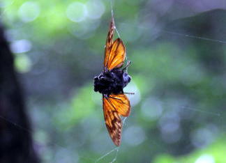 クモの巣に掛かってもがくリュウキュウアブラゼミ