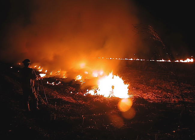 夕暮れと共にサトウキビ畑のあちこちから煙が湧きあがる。 あたりが暗くなるにつれ炎が浮かび上がり、幻想的な光景を醸し出す。 キビの刈り取り後のハカマ焼き風景で島の冬の風物詩ともいえる光景である。 ハカマ焼きは害虫駆除の一役も担うと言う。