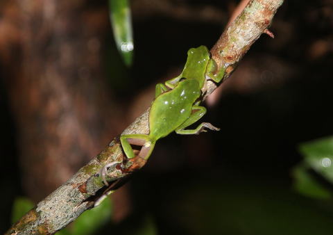 自然界では、繁殖期を迎えたカエル類が出会いを求めて大合唱を始めている。 動物の「天気予報官」とも言われるハロウアマガエルが雨が近づくと木の上で、ブィーブィーブィーと体に似合わず大きな声で鳴く。 雌の気を引こうと泣き袋を大きく膨らませ、力の限り鳴く姿は滑稽でもある。