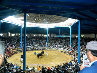| 連休期間中連日繰り広げられた闘牛大会=なくさみ館 | 闘牛のアンケートを取る琉大生 |
