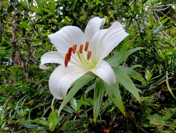【ウケユリ】 奄美地方の固有種で、白い大輪の花をつけるカサブランカの交配原種で、ビロードのような純白の花びらと赤褐色のおしべの大輪が気品ある芳香を放つ。瀬戸内町の請島や奄美大島の一部、徳之島の山岳地帯などごく限られた地域の山中や渓流のがけなどにわずかに自生している |