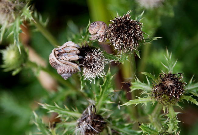 オカヤドカリはアダンの実が大好物だが、雑食のためシマアザミの花やソテツの実の綿毛なども食べる。