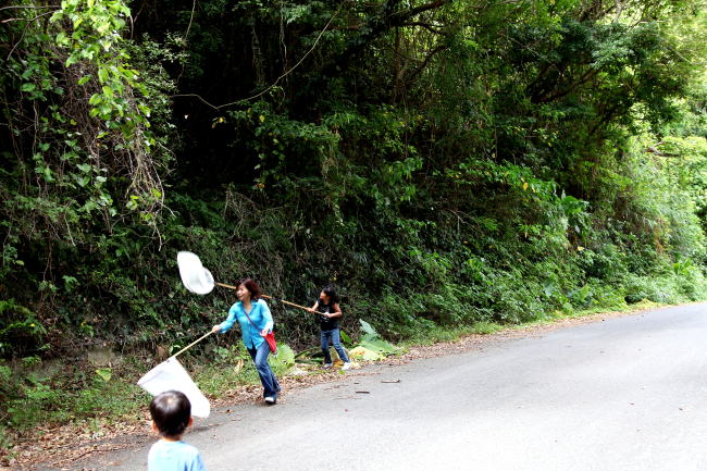 ツマベニチョウを追う親子=4日、天城町秋利神