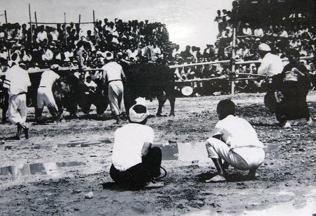 | 実熊牛を応援するタフさん(右)= 昭和29年 亀津長浜闘牛場 (撮影:加川哲夫氏) |