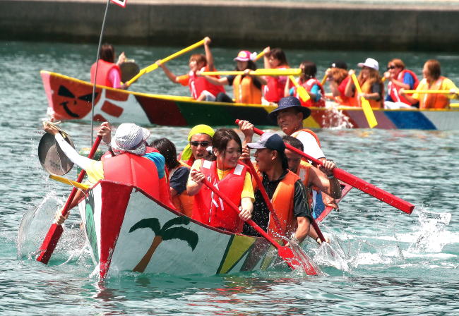 徳之島の夏祭りの最後を飾る第32回徳之島町どんどん祭ハーレー舟大会が25日、山漁港であった。 大会は漁港内の約100㍍先のブイを折り返すコースで行われ、町内外から職場や同好会など39チームが参加、力強いかいさばきで熱戦を繰り広げた。